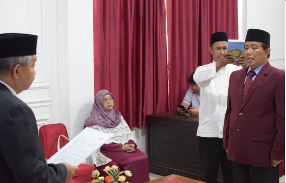 Prosesi pengambilan sumpah Dr. H. Joko Tri Brata,M.Si sebagai Ketua Prodi Magister Ilmu Pemerintahan Pascasarjana Unsultra berlansung di Aula Rektorat Unsultra pada, Rabu, (12/6/2024.)