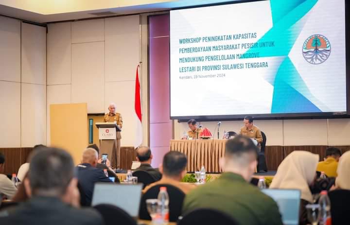 KENDARI, OKESULTRA.ID- Sekretaris Daerah Provinsi Sulawesi Tenggara (Sultra) Sultra, Drs. Asrun Lio.,M.Hum.,Ph.D., membuka secara resmi Workshop Peningkatan Kapasitas dan Pemberdayaan Masyarakat Pesisir untuk mendukung pengelolaan Mangrove di Provinsi Sulawesi Tenggara, kegiatan berlangsung di Hotel Claro Kendari, Selasa (19 November 2024).