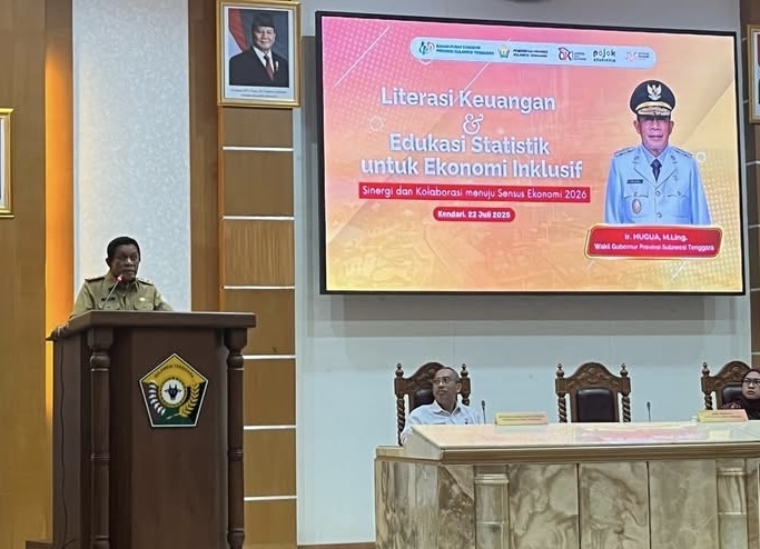 KENDARI, OKESULTRA.IS – Wakil Gubernur Sulawesi Tenggara, Ir. Hugua, M.Ling., secara resmi membuka kegiatan bertajuk Literasi Keuangan dan Edukasi Statistik untuk Ekonomi Inklusif melalui Sinergi dan Kolaborasi Menuju Sensus Ekonomi 2026, yang berlangsung di Ruang Pola Bahteramas, Kantor Gubernur Sultra, Selasa (22/7/2025).