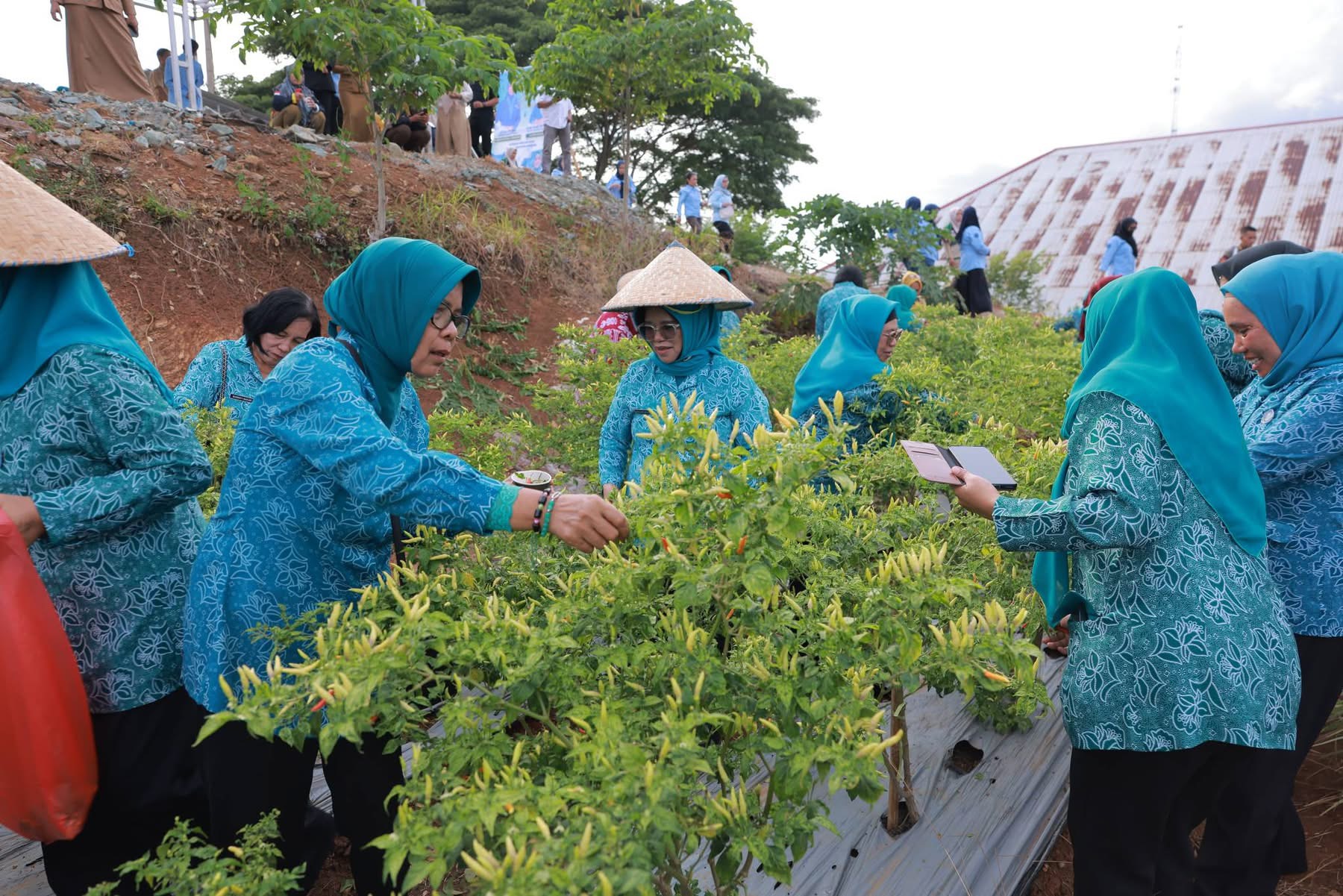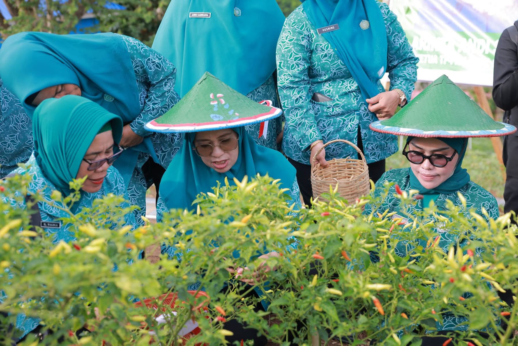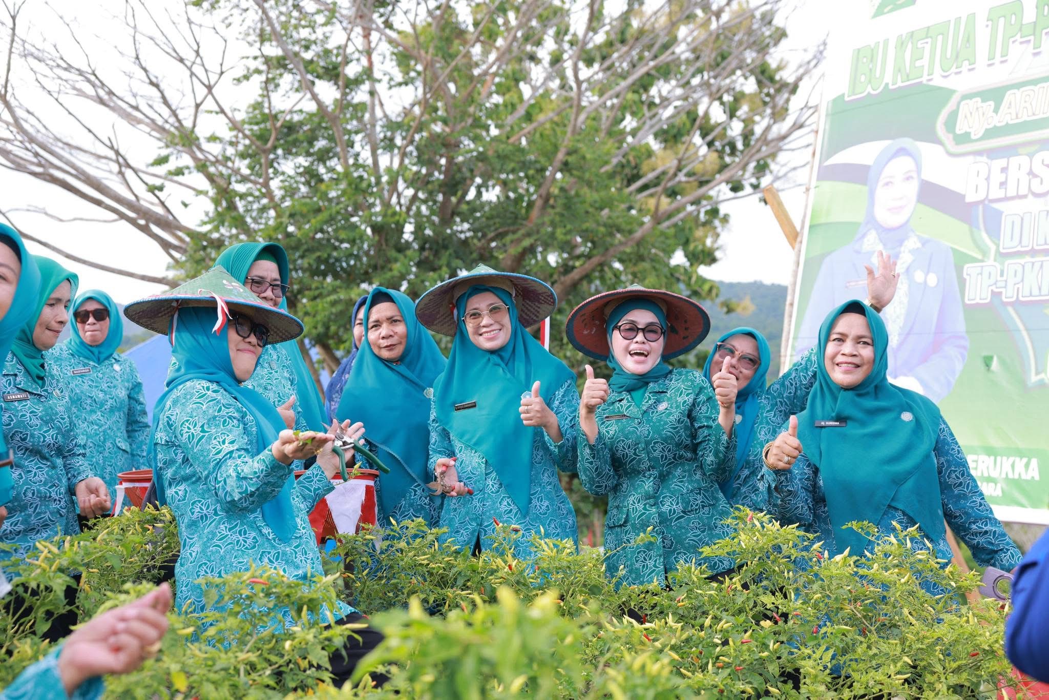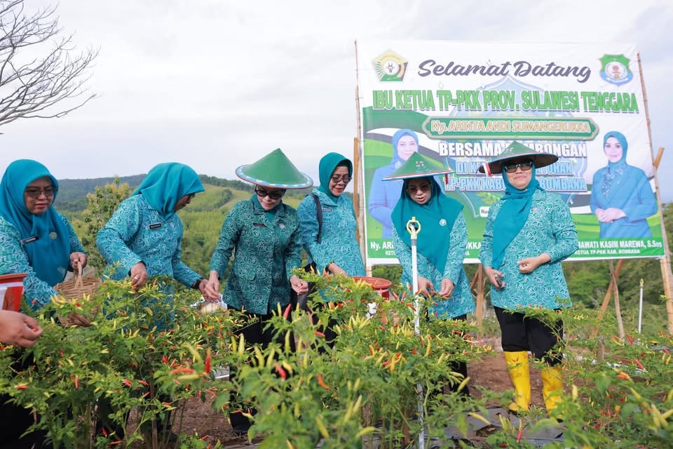 Ketua Tim Penggerak PKK Provinsi Sulawesi Tenggara, Ny. Arinta Nila Hapsari A. Sumangerukka, didampingi Staf Ahli TP PKK Provinsi Sulawesi Tenggara Ny. Ratna Lada Hugua, bersama Bupati Bombana Ir. Burhanuddin, M.Si., serta Ketua TP PKK Kabupaten Bombana Hj. Fatmawati Kasim Marewa, S.Sos, turut turun langsung memanen hasil kebun bersama jajaran TP PKK dan pemerintah daerah.